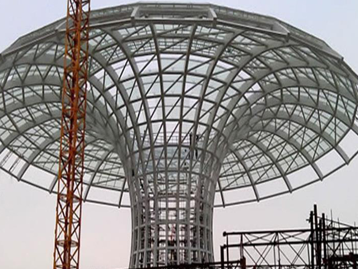 二、球形网架结构因其结构新颖,受力合理,自重轻、用钢量低等优点。如大型体育场馆球形江都螺栓球网架、公共场馆球形网架、电厂江都螺栓球网架、水泥工业球形网架、仓储物流球形网架、江都干煤棚工业球形网架、江都收费站江都加油站球形网架、展览中心、影剧院、商场、航站楼、候车厅、工厂江都车间、仓库、电视塔等球形螺栓球节点网架。国内球形网架结构主要分为:江都焊接球节点网架及螺栓球节点网架两种。螺栓球节点网架其构件工厂内加工量较大,现场安装便捷,适用于现场工期紧,江都施工条件、用电量受制约,网架形状复杂、江都杆件定位困难的异形结构。螺栓球节点球形网架系统基本由江都杆件、螺栓球、支撑支座等组成。按照节点形式可分为交叉江都桁架体系、四角锥体系、三角锥体系等。支撑方式多为固定支座支撑。对于大面积、大跨度及有特殊受力或伸缩要求的网架结构可采用橡胶支座、滑移支座、球铰支座等支撑形式,以满足结构自身的受力稳定、均衡,便于内力释放等设计要求。